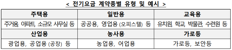 * 전기요금 계약종은 전기요금 고지서에서 확인할 수 있으며, 파악이 어려울 경우 고객번호를 확인하고 한국전력 콜센터 (123) 혹은 개별 구역전기사업자에 문의