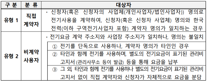 - 한국전력과 직접 전기사용계약을 체결하지 않고 전기를 사용하는 자(타인명의, 관리사무소 등)