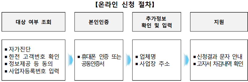 ※ 온라인 신청을 원칙으로 하며 포털사이트에서 “소상공인 전기요금 특별지원” 검색 또는 주소창에 “소상공인전기요금특별지원.kr” 입력하면 접속 가능