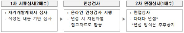 - 1차 서류심사를 통해 2배수를 선발하고, 서류합격자 대상 온라인 인성검사 시행(면접 시 참고자료로 활용), 2차 면접심사 결과 고득점자 순으로 최종대상자 선발