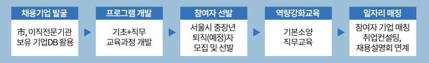 중장년 재취업을 위한 교육과정 개발 및 집중교육, 채용기업 발굴 및 취업 매칭까지 통합 지원합니다.