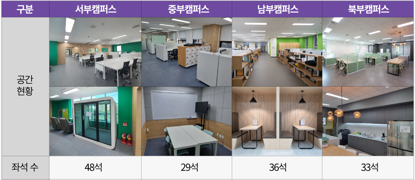 - 캠퍼스별 거점을 활용한 사무공간 지원(책상, 의자, 사물함, 회의실, 휴게실 등)