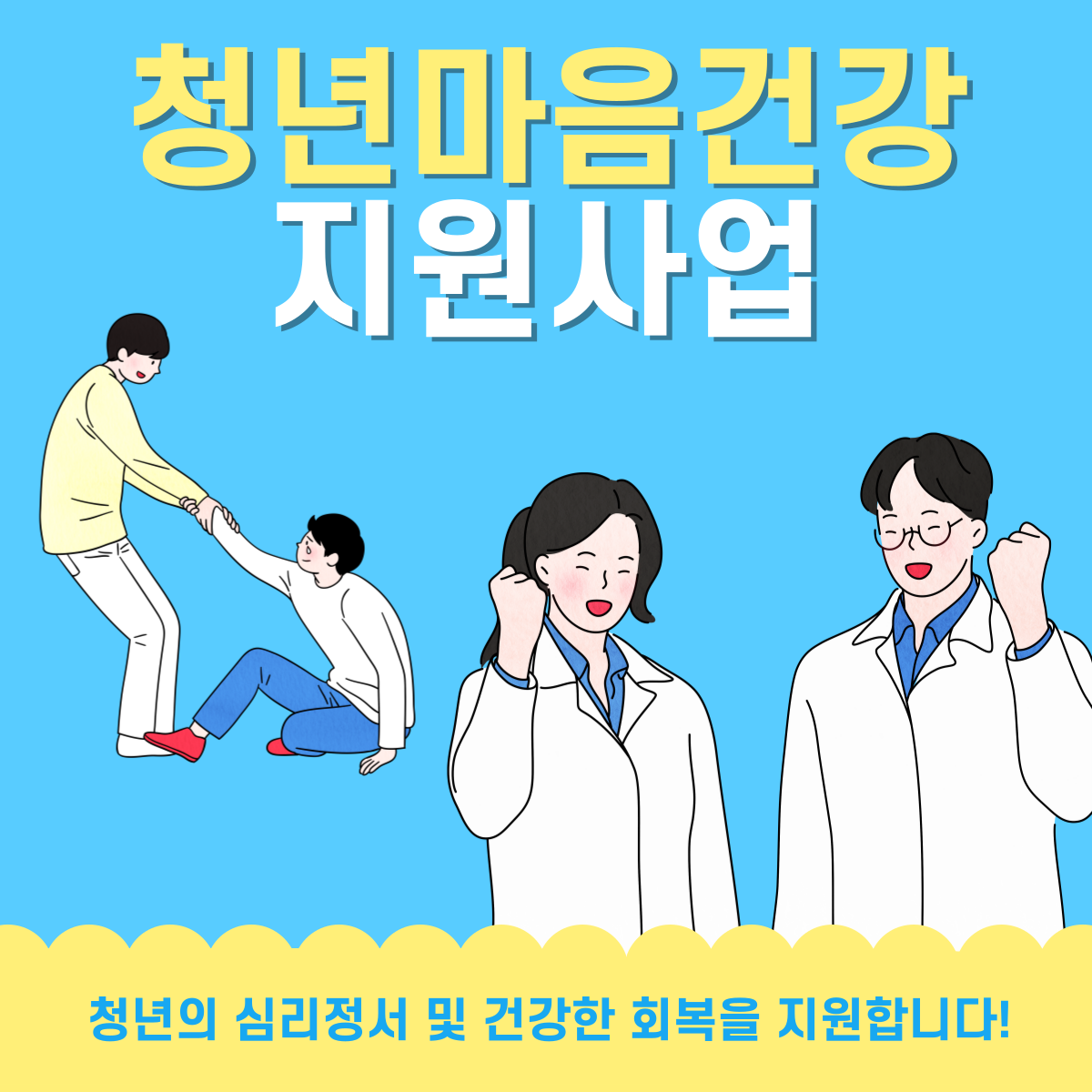 청년의 심리정서 지원, 건강상 회복을 통한 삶의 질 향상과 심리적 문제 예방을 통한 건강한 사회구성원으로서 역할 촉진을 도와주기 위한 청년 지원 사업입니다.