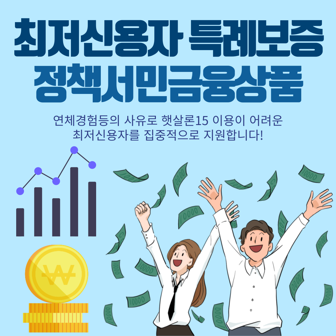 불법사금융 피해 방지를 위해 연체경험 등의 사유로 현재 정책서민금융상품(햇살론15) 이용이 어려운 최저신용자를 집중적으로 지원하는 보증부 정책서민금융상품