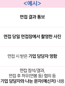 ※ 위의 예시 외에도 신청자가 면접 대상자였으며, 면접 당일에 실제로 응시하였음을 확인할 수 있는 자료로 검증 가능하며 필요 시, 추가 자료 요청 및 면접 기업 연락을 통한 추가 확인을 진행할 수 있습니다.