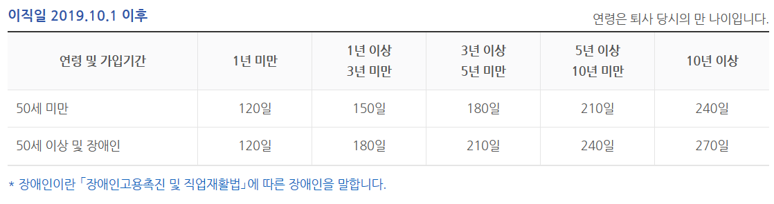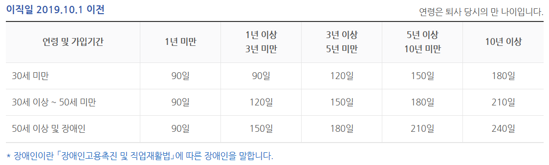 (이직일이 2019.10.1 이전은 퇴직 전 평균임금의 50% × 소정급여일수)